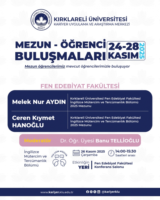 Kariyer Uygulama ve Araştırma Merkezimize bağlı olarak faaliyet gösteren Kırklareli Üniversitesi Mezunlar Ofisi koordinatörlüğünde 2025 -2026 Eğitim Öğretim Dönemi "Mezun Öğrenci Buluşmaları" etkinlikleri düzenlenecektir. Etkinlik kapsamında mezun öğrencilerimiz Melek Nur Aydın ve Ceren Kıymet Hanoğlu, 26 Kasım Çarşamba günü sizlerle buluşacaktır.