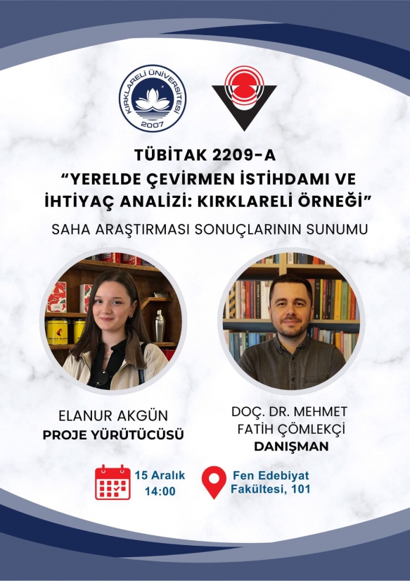 Mezun öğrencimiz Elanur Akgün “Yerelde Çevirmen İstihdamı ve İhtiyaç Analizi: Kırklareli Örneği” başlıklı Tübitak 2209-A projesinin saha araştırmasından çıkan sonuçlarını 15 Aralık Pazartesi günü saat 14:00’da Fen Edebiyat Fakültesi 101 nolu sınıfta bir sunum ile paylaşacak. Tüm öğrenci ve hocalarımızı aramızda görmekten memnuniyet duyarız.