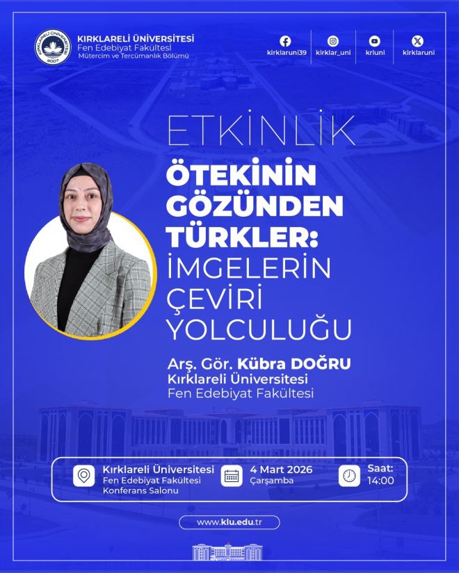 Arş. Gör. Kübra Doğru’nun konuşmacı olarak yer alacağı “Ötekinin Gözünden Türkler: İmgelerin Çeviri Yolculuğu” başlıklı etkinlik 04.03.2026, 14.00'da, Fen Edebiyat Fakültesi Konferans Salonunda gerçekleşecektir.