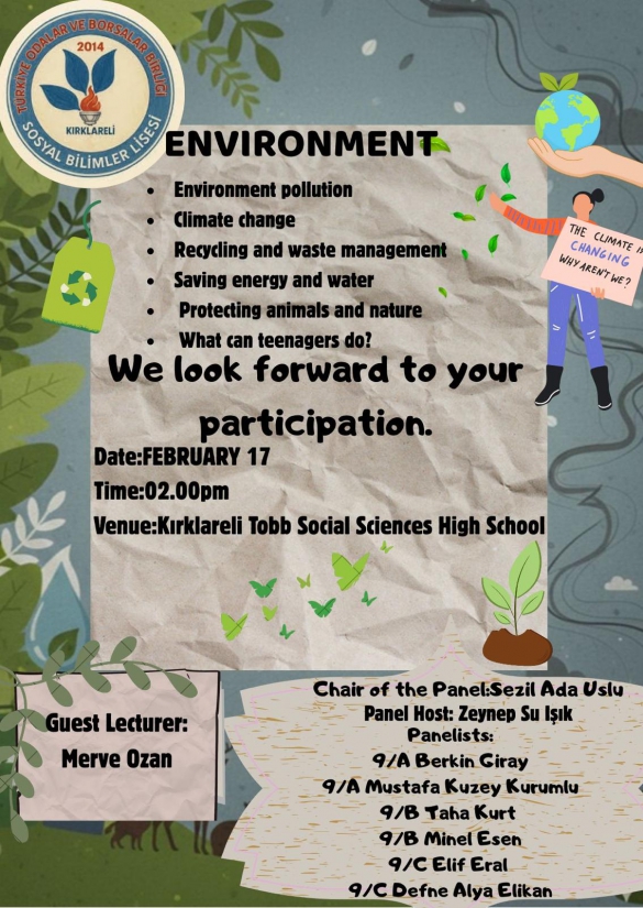 17 Şubat 2026 tarihinde Kırklareli TOBB Sosyal Bilimler Lisesi'nde düzenlenen "Çevre" konulu İngilizce panelde bölümümüz öğretim elemanı Arş. Gör. Merve Ozan davetli konuşmacı olarak yer almıştır. Öğrencilerin çevre ile ilgili farklı konularda yaptığı konuşmaların ardından, Ozan da panele son konuşmacı olarak katkılarını sunmuştur. Nazik davetleri için TOBB Sosyal Bilimler Lisesi yönetimine, paneli düzenleyen İngilizce öğretmenlerine, öğrencilere ve tüm katılımcılara teşekkür ederiz.