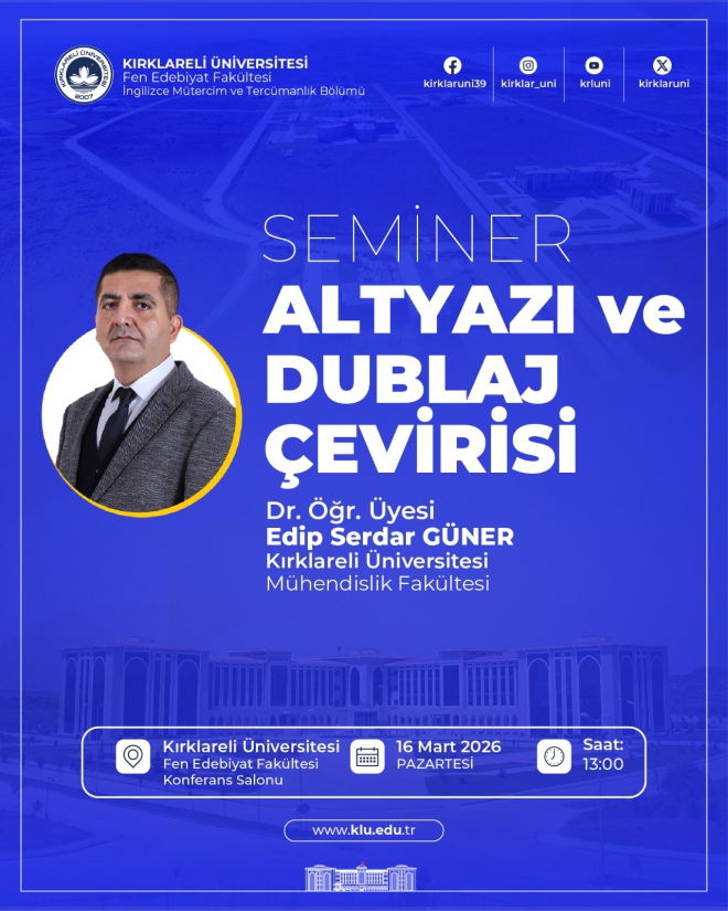 Mühendislik Fakültesi öğretim üyelerinden Dr. Öğr. Üyesi Edip Serdar Güner'in konuşmacı olarak yer alacağı "Altyazı ve Dublaj Çevirisi" başlıklı seminer, 16 Mart 2026 Pazartesi günü saat 13.00'da Fen Edebiyat Fakültesi Konferans Salonunda gerçekleşecektir. Tüm akademik ve idari personelimiz ile öğrenciler davetlidir.